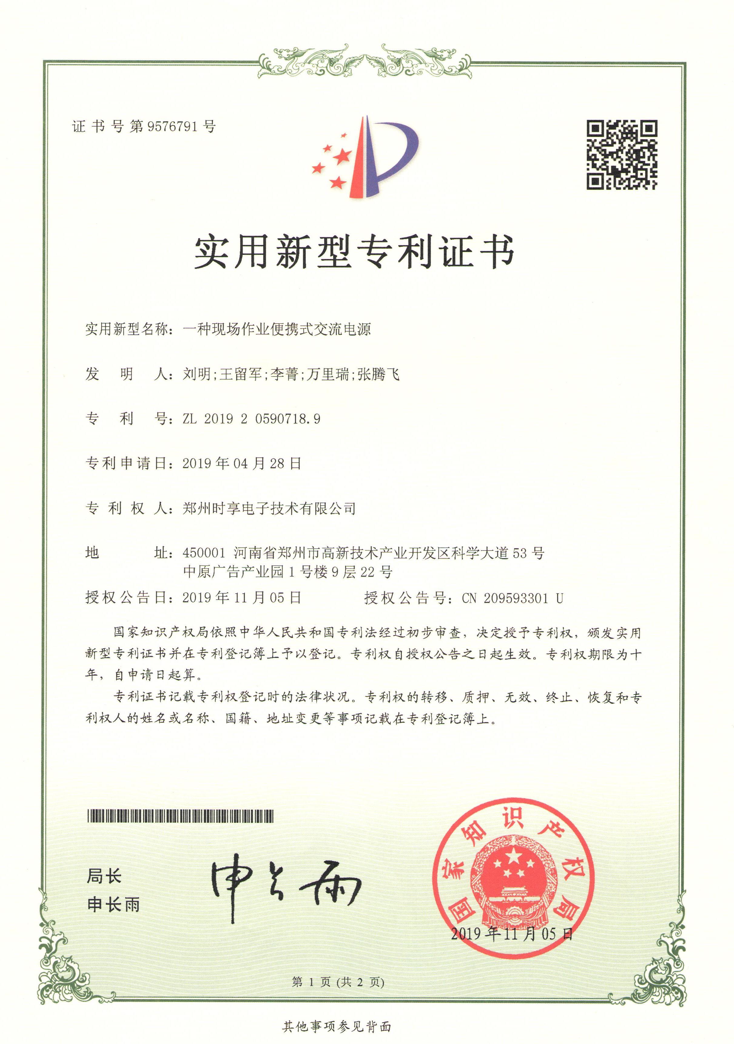 本產(chǎn)品獲得實用新型專利證書,證書號第9576791號。