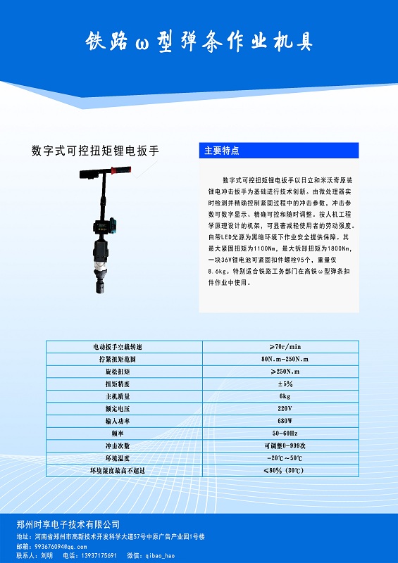 數(shù)字式可控扭矩鋰電扳手以日立和米沃奇原裝鋰電沖擊扳手為載體進行技術創(chuàng)新,由微處理器實時檢測并精確控制緊固過程中的沖擊參數(shù),且沖擊參數(shù)數(shù)字顯示并可設定和調(diào)整。按人機工程學原理設計的“T”機架可顯著減輕使用者的勞動強度,自帶LED光源為黑暗環(huán)境下作業(yè)安全提供保障。一塊36V&10Ah電池可松緊螺栓100個,特別適合鐵路工務相關單位在高鐵軌道養(yǎng)護維修、明橋面橋無縫線路養(yǎng)護維修中對各種型號ω型彈條扣件或K式扣件施加精確的緊固扭矩(扣壓力),保證作業(yè)質量。